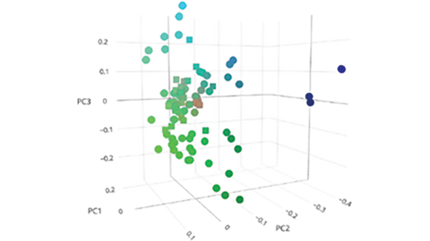 An efficient comparison of cultivars, providing compressed visualization in either two (2D) or three (3D) dimensions of the differences and similarities between all individuals within a population, allowing to identify clusters of high relatedness, membership within subpopulations and genetic outliers. Clones are revealed and cultivars ranked by genetic stability, shared ancestry and other key metrics.